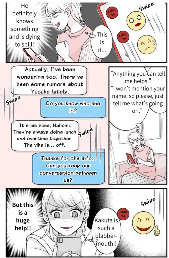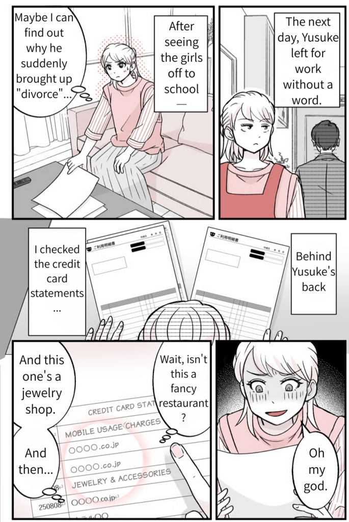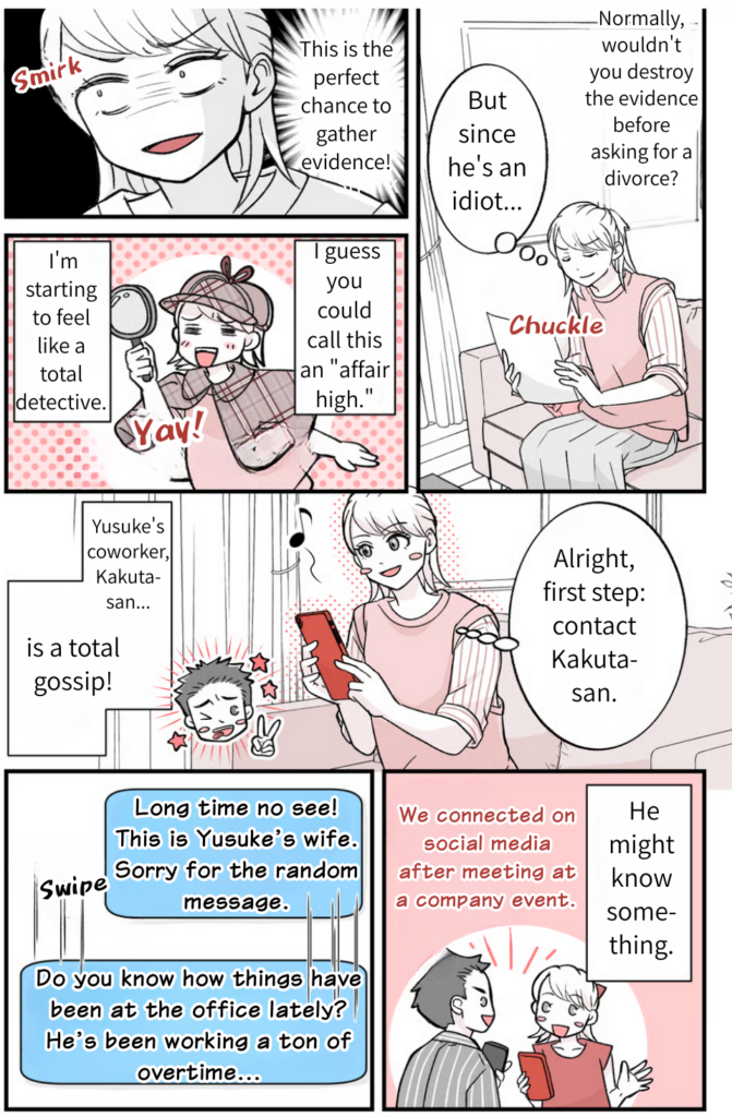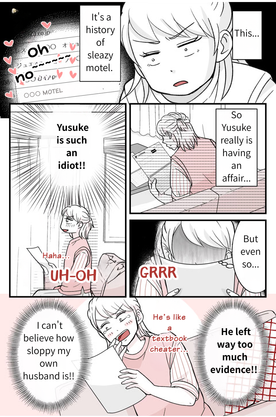 The next morning, I went through the credit card statements. I found a history of love hotel stays—proof of Yusuke’s affair. Swallowing my bitterness, I decided right then and there to gather as much evidence as possible. I reached out to Yusuke’s coworker, Kakuta, and the whole picture came into focus pretty quickly. I felt a messy mix of total contempt for Yusuke and a hollow sense of “I knew it.” But at the same time, there was a tiny bit of relief in finally knowing the truth. Now, I need to dig up more evidence and plan my next move.