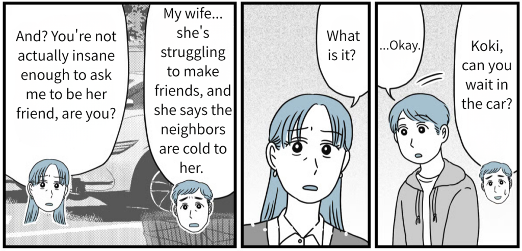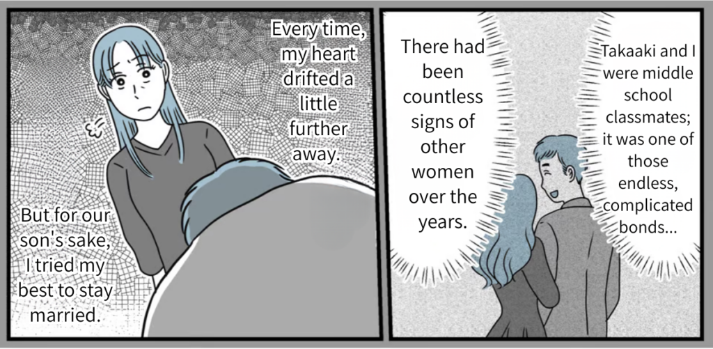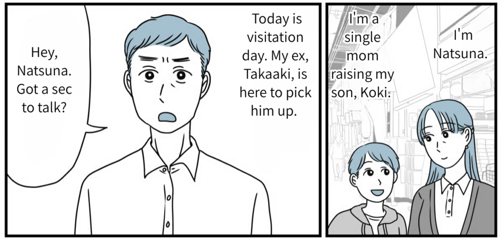 I’m Natsuna, 35. I’m a single mom raising my 9-year-old son, Koki. I divorced my ex-husband, Takaaki, about three years ago. We were middle school classmates—one of those “can’t-ever-really-get-away-from-each-other” types. Even now, we both live in the same hometown. When we split, I got a decent settlement, and the child support hits my account every month, so I’ve let him keep his visitation rights. Today is our monthly visit. Takaaki just pulled up in his car to pick up our son.