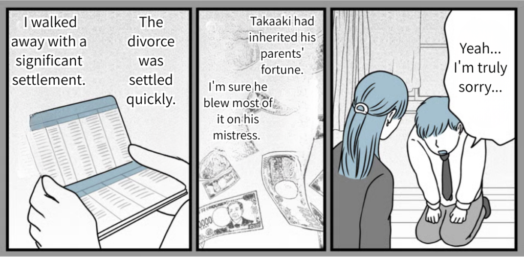We had to move out of the house I shared with Takaaki, but I walked away with a significant amount in alimony. As long as he keeps paying the monthly child support, I’ve agreed to let him continue seeing our son.
