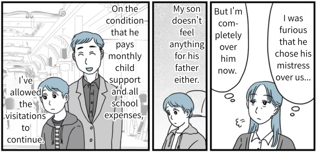 I was furious that he prioritized his mistress over us, but honestly, I’m totally over him now. My son doesn’t have much of an emotional bond with a father who ignored his family to go out and play, either. Because of that, I didn’t feel like putting up a fight… and the divorce went through without a hitch.