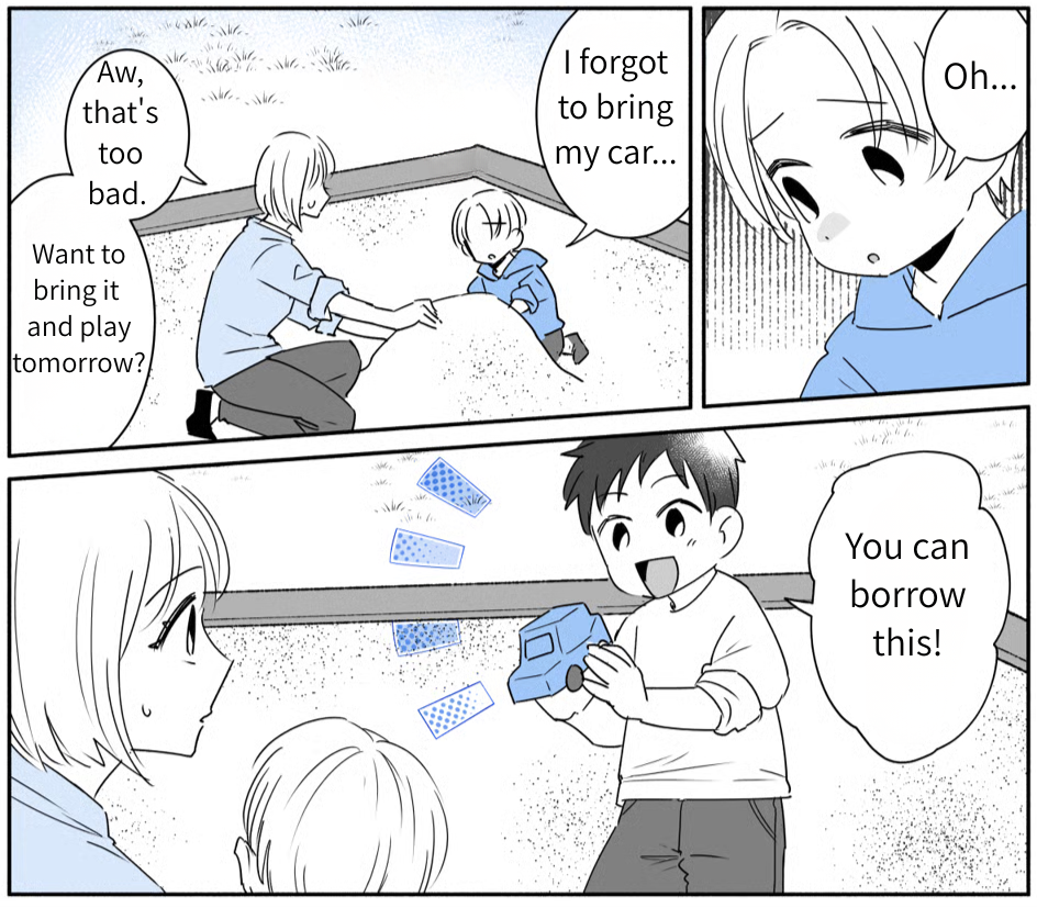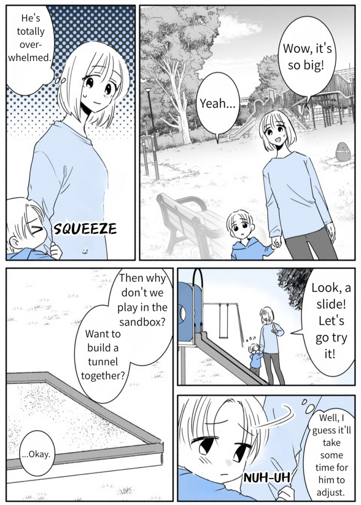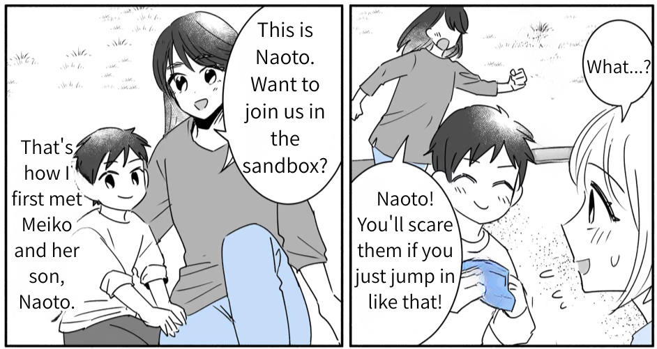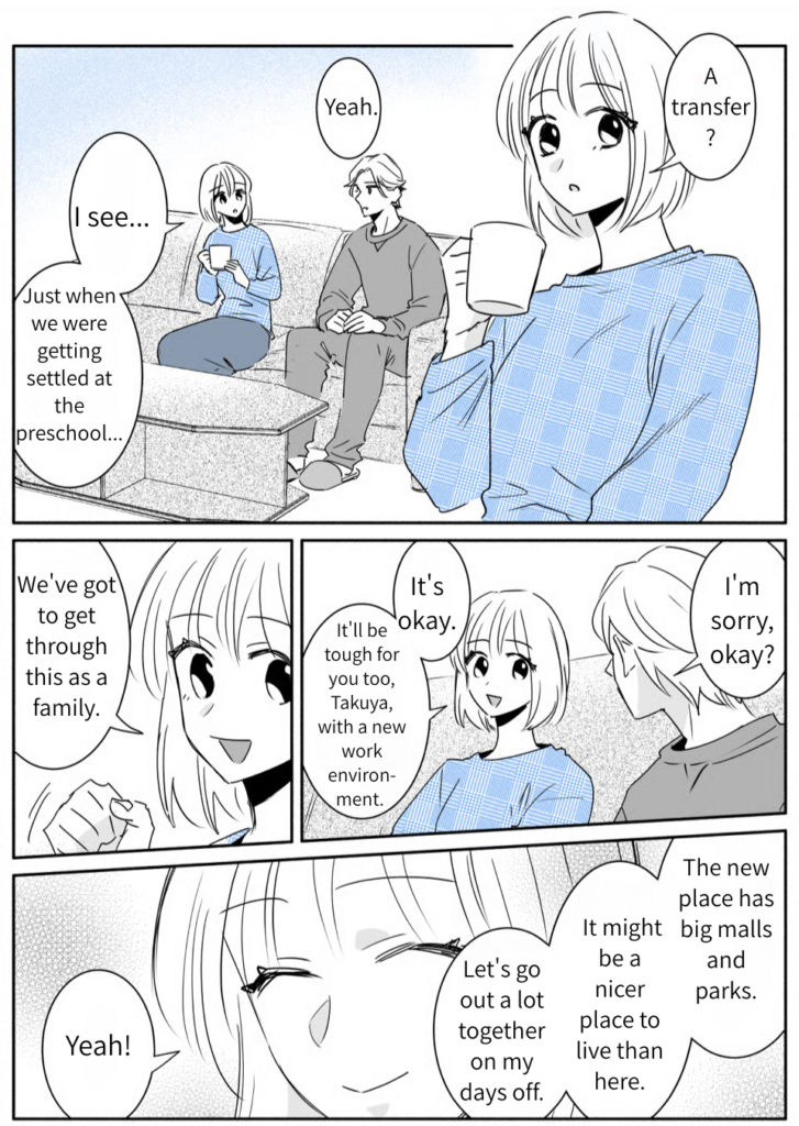 I’m Anna, and I live with my husband, Takuya, and our preschooler, Asahi. Being pretty shy myself, I was naturally drawn to Takuya’s outgoing, social personality, which is why I married him. He treats Asahi and me so well—every day is honestly a dream. But recently, Takuya’s job required us to pack up and move. Asahi takes after me, so he’s the type who needs a lot of time to warm up to new places and faces. I’m just hoping he can find his footing in our new neighborhood.