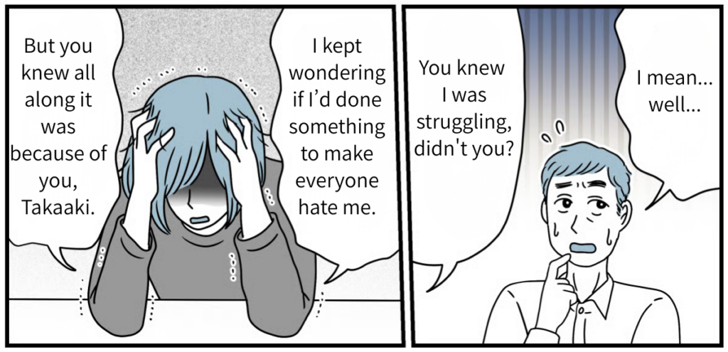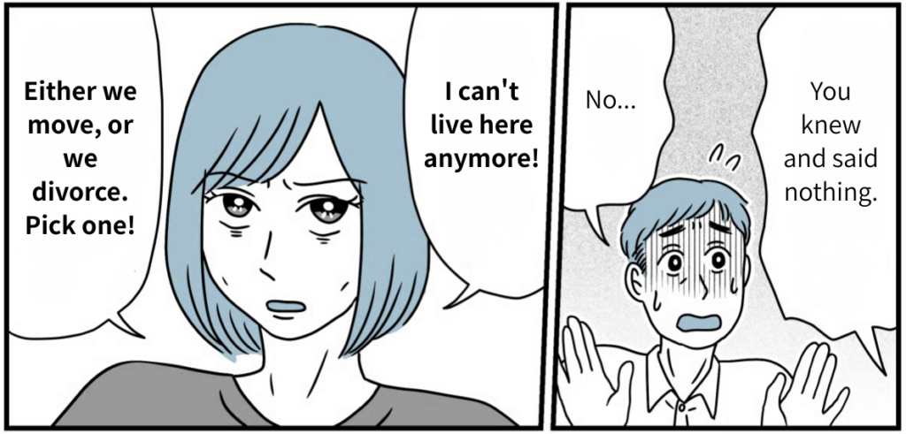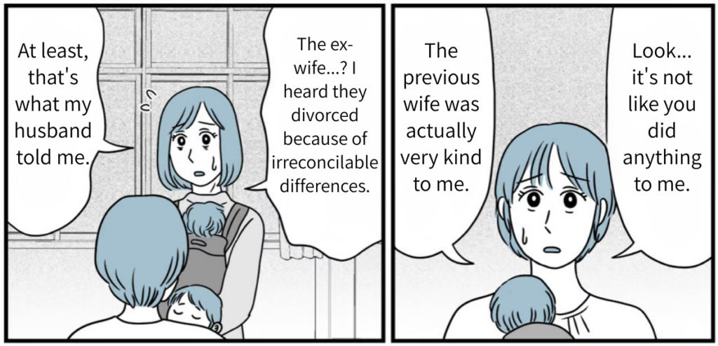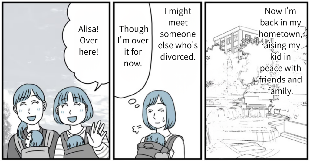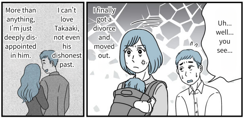 The reason I couldn’t make any friends and why the neighbors were giving me the cold shoulder—it wasn’t my fault at all. I couldn’t stand the thought of spending the rest of my life suffering in this place. Even when I pushed for us to move, Takaaki just made excuses, saying things like, “I can’t leave the house I inherited from my parents” or “You should just ignore it.” He didn’t show an ounce of backbone or any desire to protect his wife and child. I was so deeply disappointed by his attitude that I decided to get a divorce.