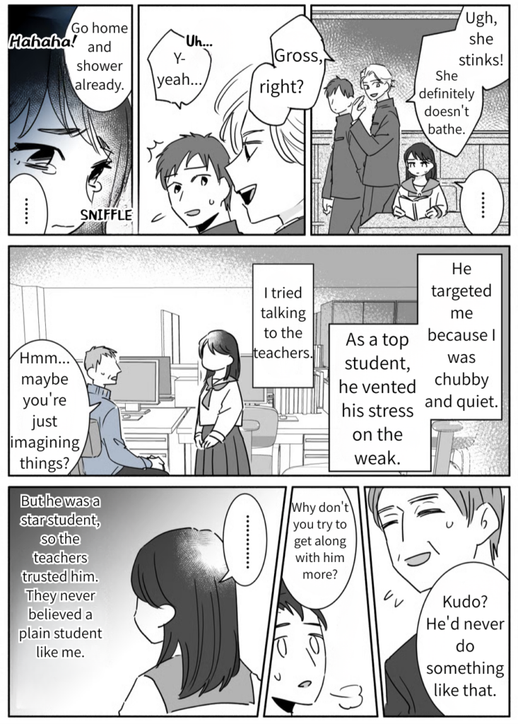 The “Takuya Kudo” the teachers saw was a total stranger to the one I had to deal with. No matter what I said, the teachers never believed a word out of my mouth, leaving me to just endure his endless bullying day after day. That’s why I was so desperate to leave that town; I buried myself in my books and studied like my life depended on it. Once I got to high school, my life was finally peaceful and fun.