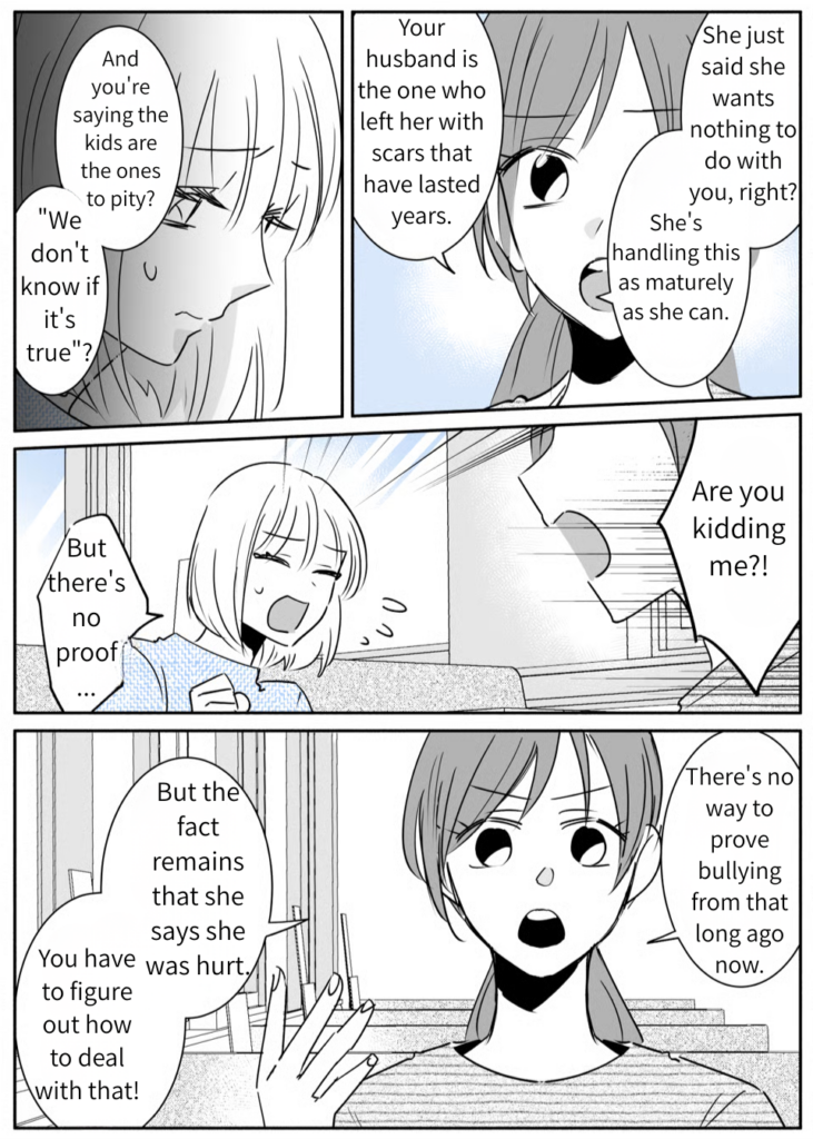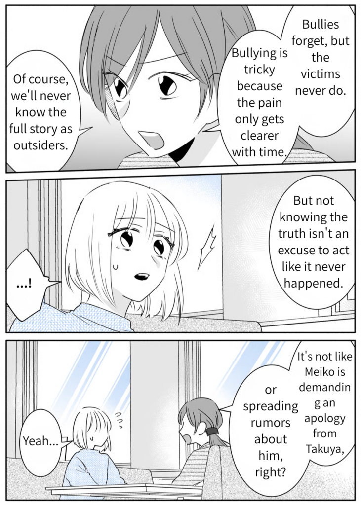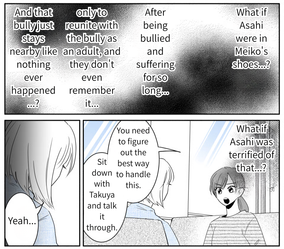 At first, I kept thinking it wasn’t right to drag the kids into a “grown-up” problem. I felt that kids should have their own world, and that we should keep our messy emotions out of it for their sake. I even caught myself wishing Meiko would be a bit more considerate. But Mariko’s words made me realize how incredibly shallow my thinking was. I don’t know for sure if what my husband did is true, but as long as she carries that pain, I have no choice but to respect her feelings and act accordingly. I need to have a real, serious talk with Takuya.