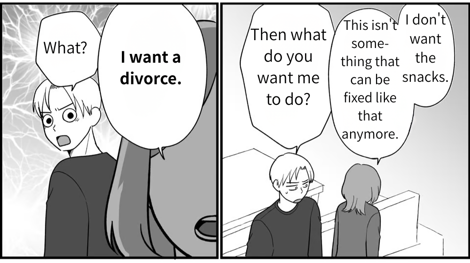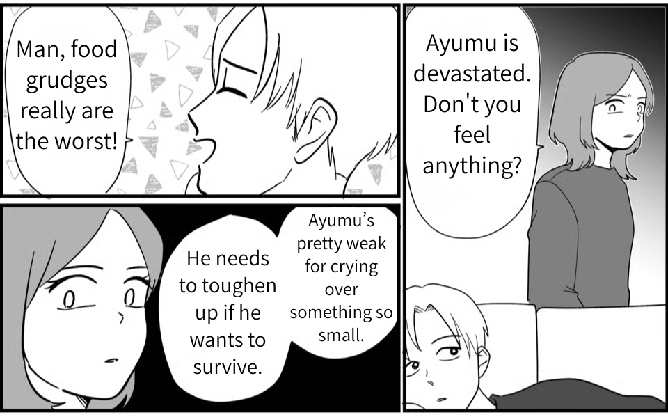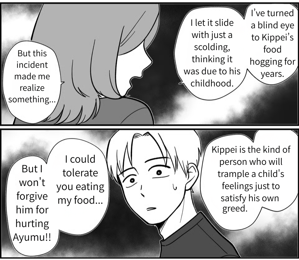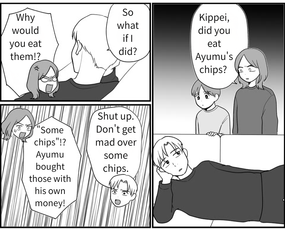 Seeing that Kippei had inhaled the snacks Ayumu bought with his own pocket money filled me with intense rage and deep despair. Even when I confronted him, Kippei just smirked and said, “Geez, food grudges are scary!” He showed zero remorse, even with his own son in tears right in front of him. Realizing then and there that “this man will never change,” I dropped the D-word: divorce. Of course, it was the result of years of pent-up frustration and exhaustion, but more than anything, I couldn’t forgive the fact that he let his own greed make Ayumu cry.