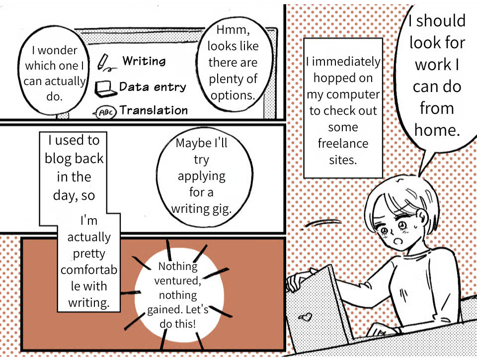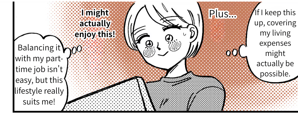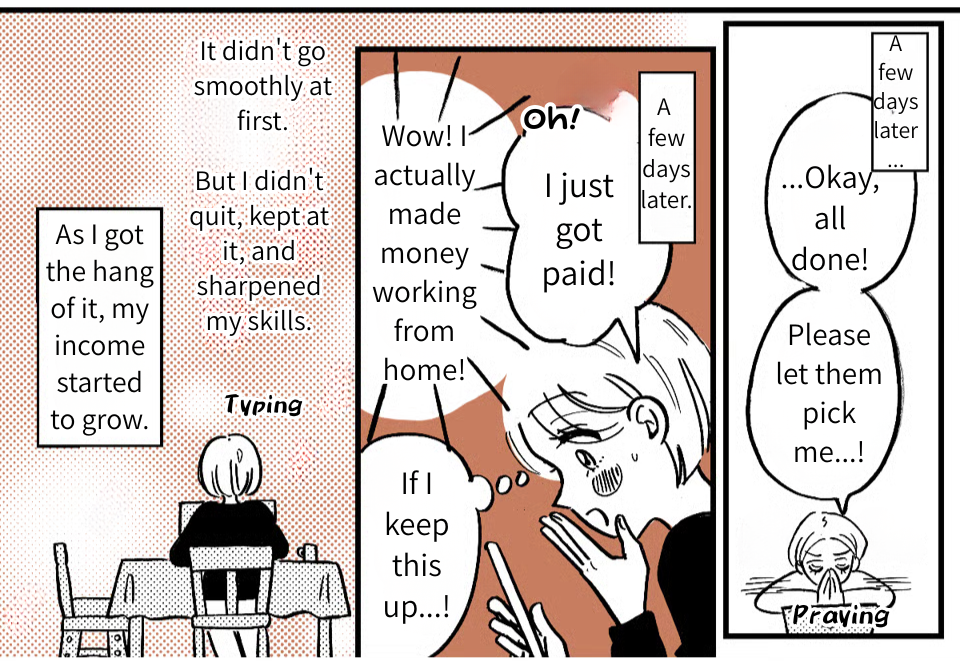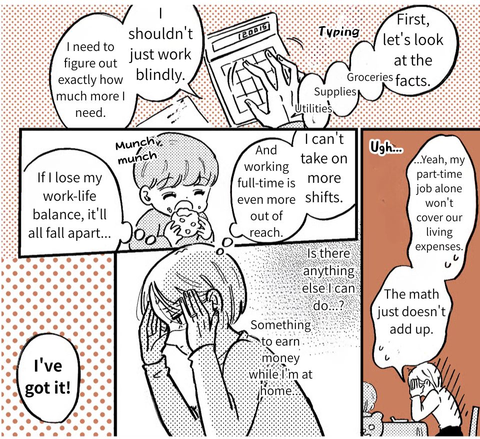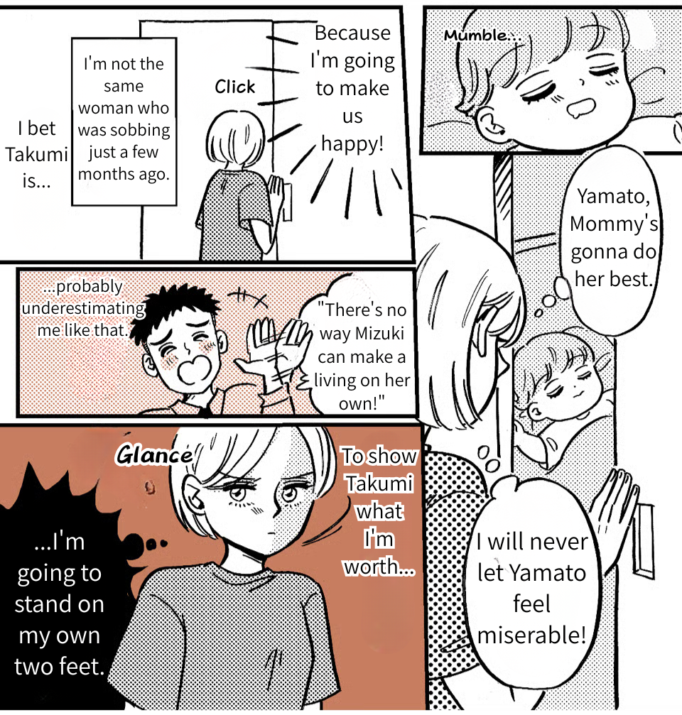 I was devastated by Takumi’s betrayal. But for Yamato’s sake—and more importantly, for my own—I decided to take a stand. Looking over my finances, it hit me that my cafe job alone wouldn’t even come close to covering our living expenses. So, I started looking into remote work and gave freelance writing a shot. It was rough going at first, but I slowly found my rhythm and sharpened my skills. Then, the payments started hitting my account, and I realized I could actually make a living working from home. If I keep this up, I might just be able to support us on my own.