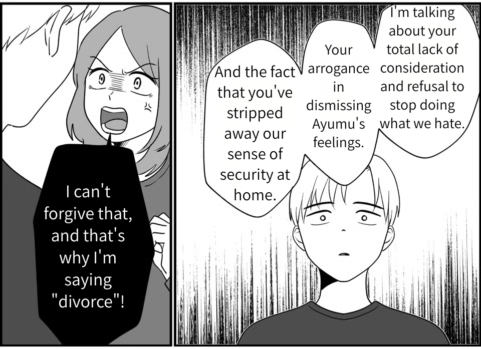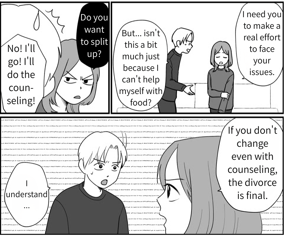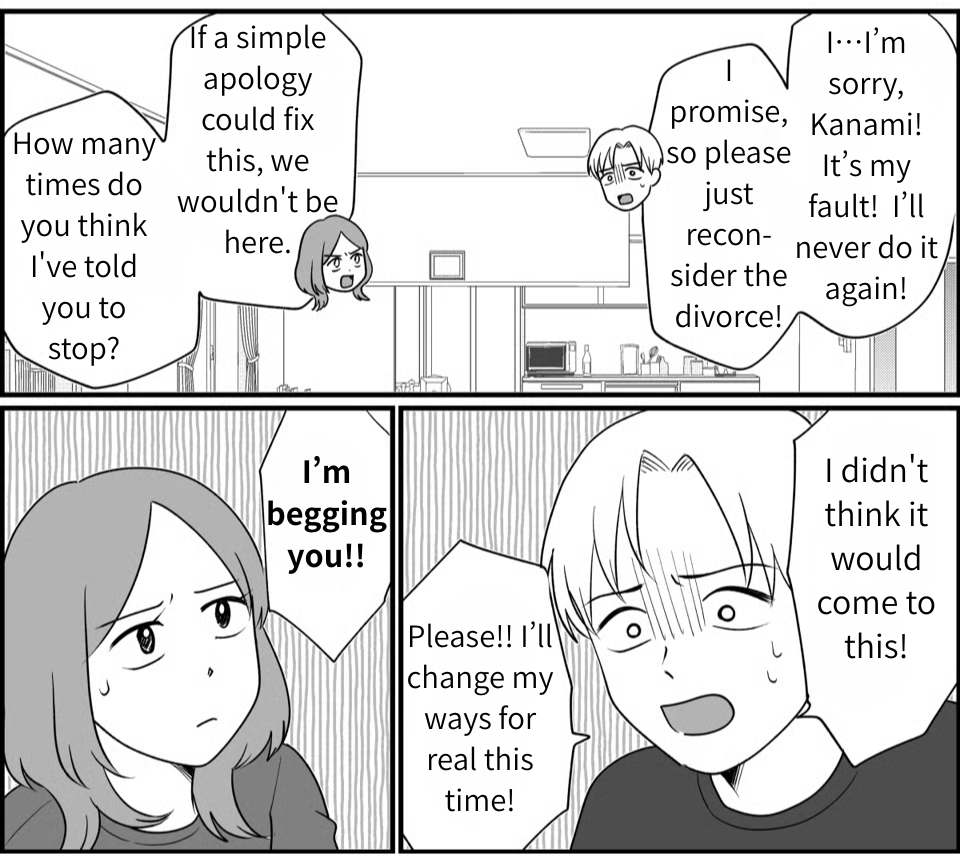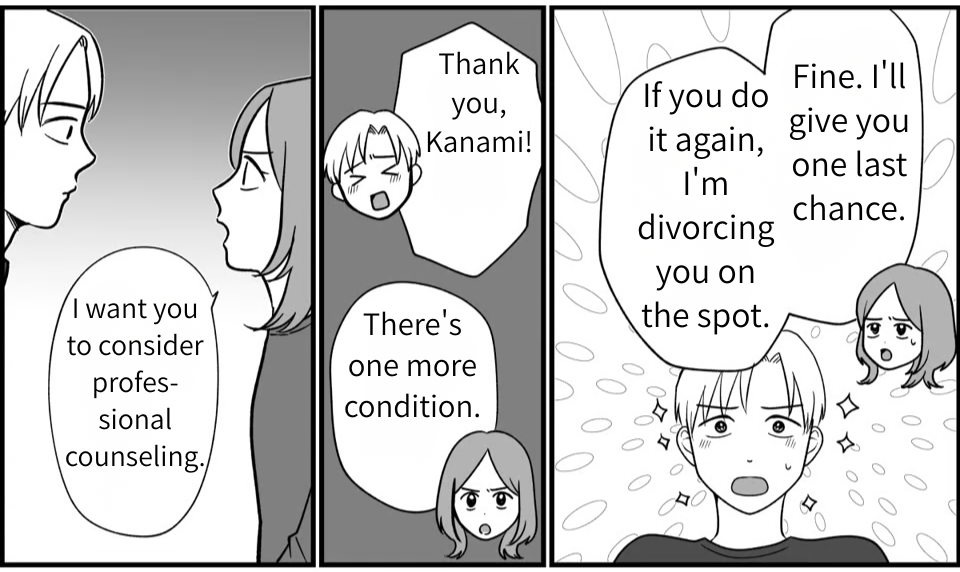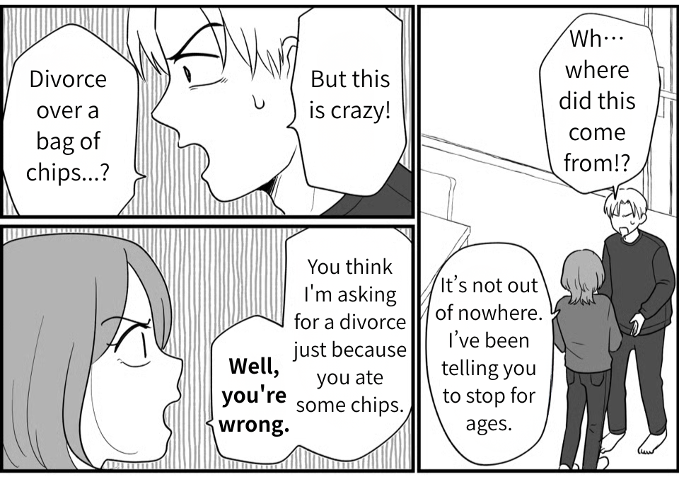 When I brought up divorce, Kippei completely missed the point, exclaiming, “Over a bag of chips!?” I had to lay out exactly what the real problem was. Seeing him turn pale as he finally grasped the gravity of the situation and started apologizing, I decided to give him one last chance. I gave him a final warning—one more time and we’re done instantly—and then pleaded with him to go to professional counseling. He was shocked at first, but eventually gave me a somber nod of agreement. I don’t know what the future holds, but for now, I have to try and believe that he can truly change…