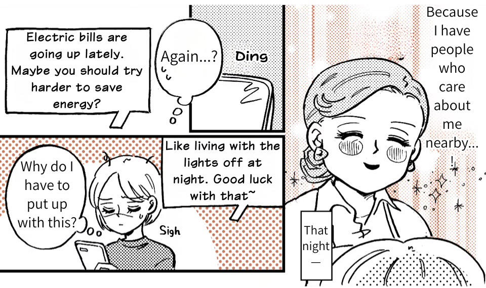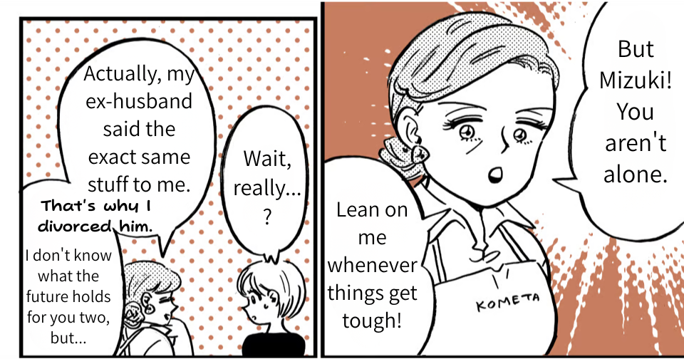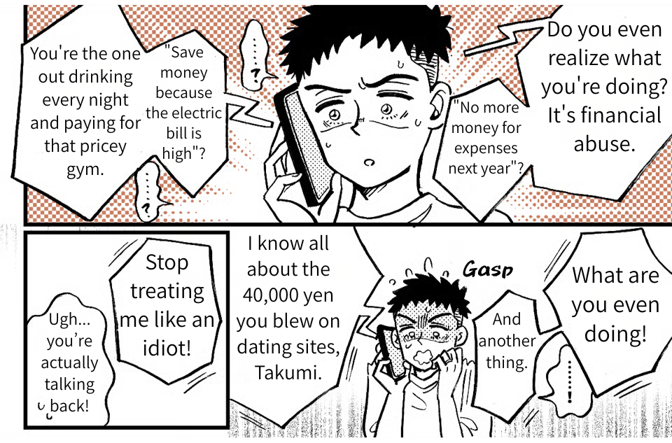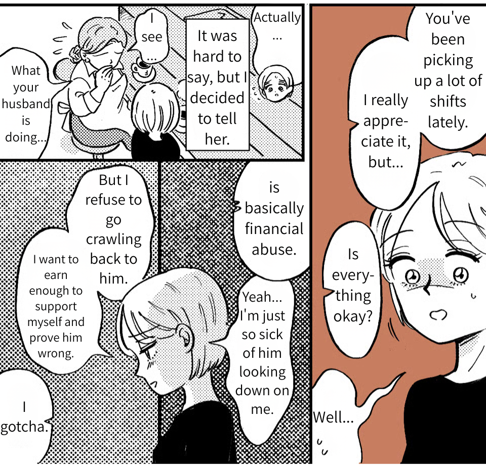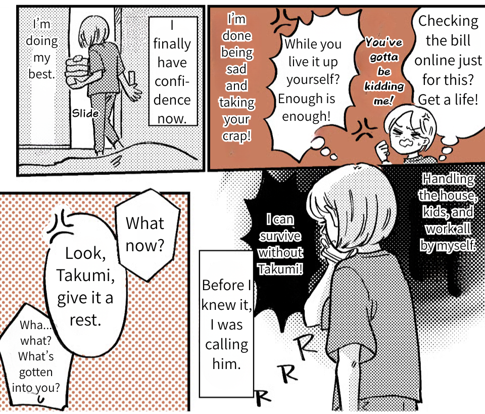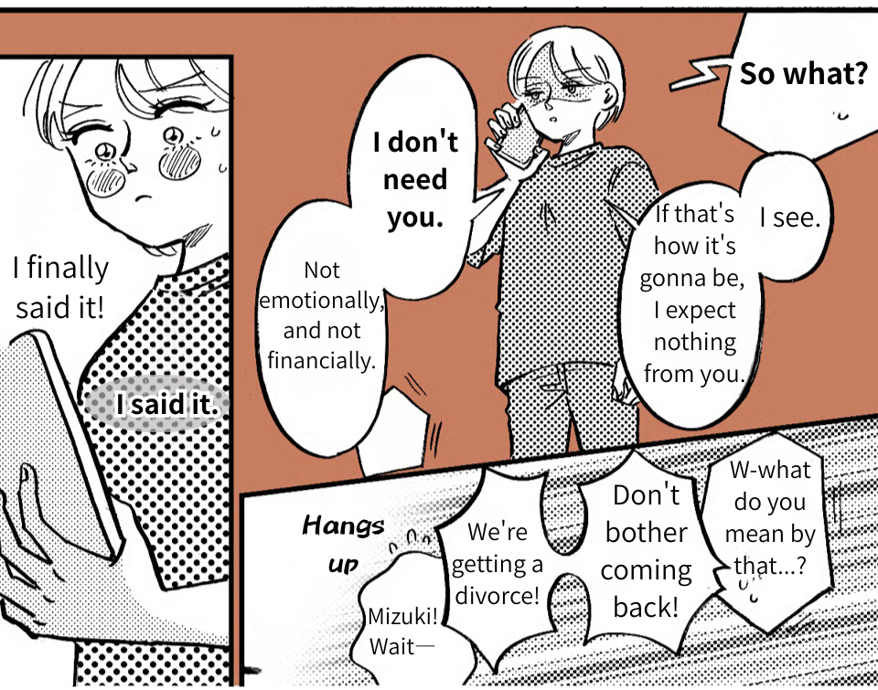 While working at the cafe, my boss pulled me aside, and I ended up opening up to her. I was shocked to find out she’d been through the exact same thing. It felt like a huge weight had been lifted. After I got home, I got a text from Takumi telling me to “save more money” because the electric bill was high. Even as I thought, “Look who’s talking,” I felt a new surge of confidence. I have people in my corner now. I can survive without him! On impulse, I called him right then and there “I’m done expecting anything from you,” I told him. “Don’t bother coming back. We’re getting a divorce!”