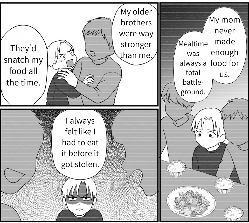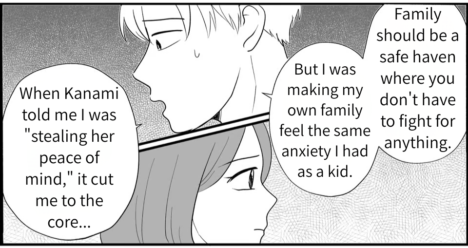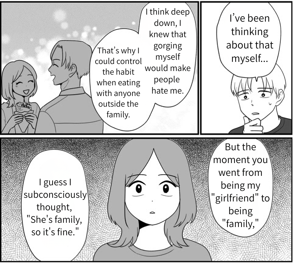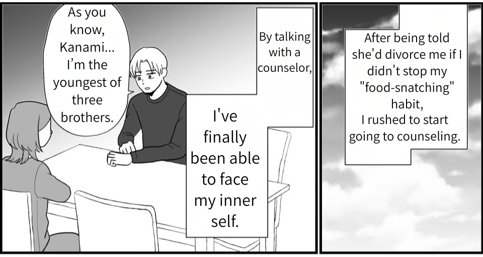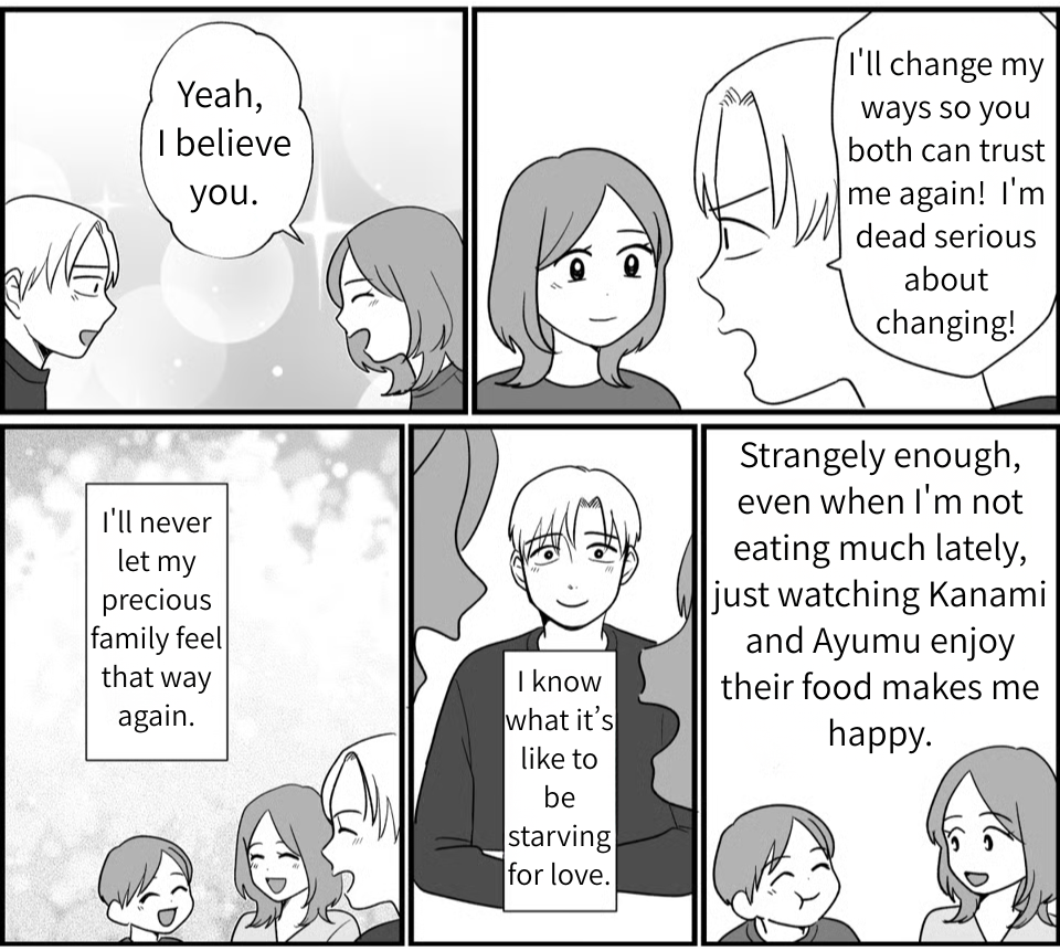 I started counseling to keep my family together. Through the sessions, I realized that growing up as the youngest of three brothers—where it was “eat or be eaten”—had left me with a deep emotional hunger. I also saw how I’d subconsciously decided it was okay to take from Kanami once she became “family.” Understanding the weight of her words, I told her I’m dead serious about changing; I can’t throw away this second chance she gave me. I’m beyond grateful she decided to believe in me. Lately, just watching my family enjoy their meals fills my heart. I’ll never let my precious family feel that kind of anxiety ever again.