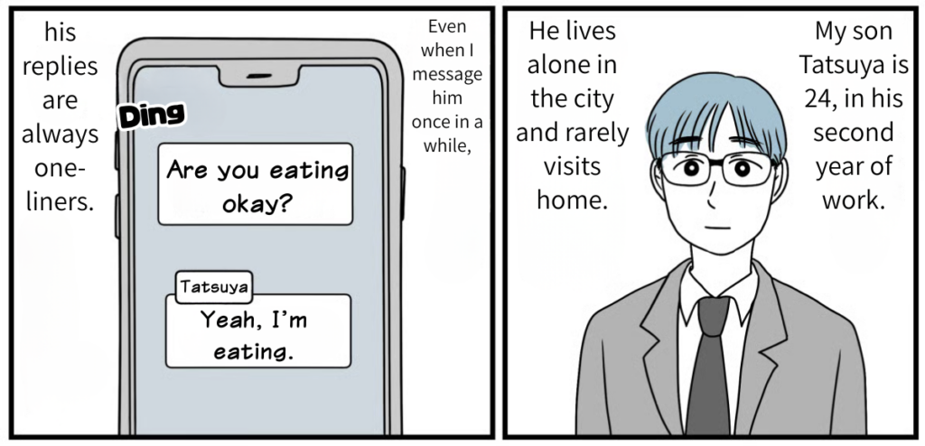 I (Hiroko) live with my husband and daughter. My son, Tatsuya (24), is in his second year of work. He landed a job at a major corporation and lives on his own in the city. He rarely shows his face back home, but I figure no news is good news and cheer him on from the sidelines. My daughter, Nami (20), is a sophomore in college. Between her part-time job and clubs, she seems to be loving campus life. Now that the kids are all grown up, I was looking forward to finally enjoying a life of my own.