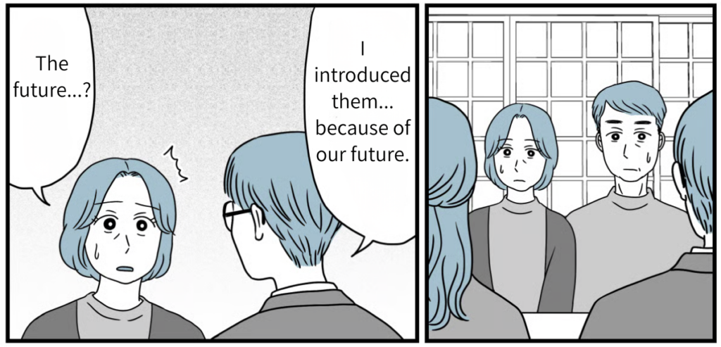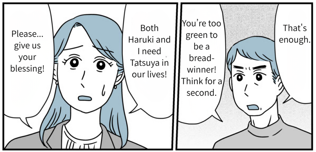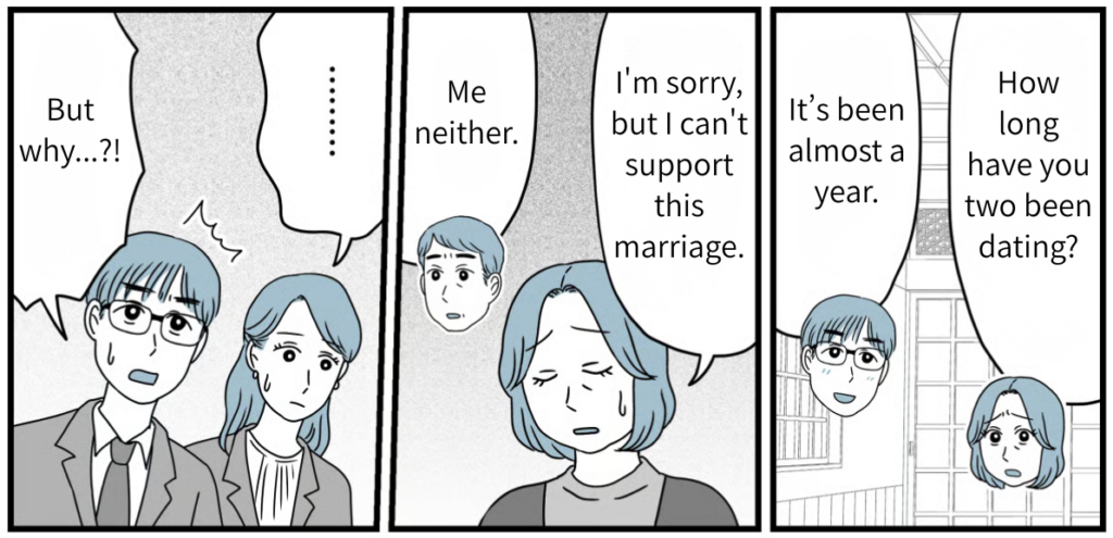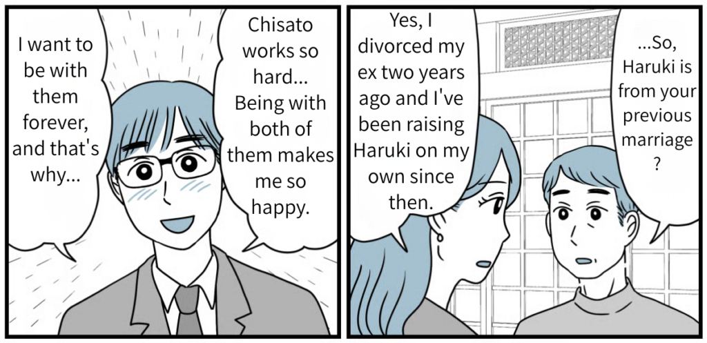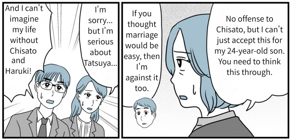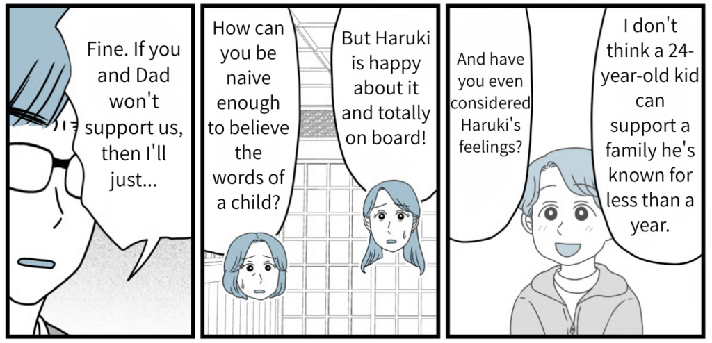 The woman Tatsuya brought home with marriage on his mind, Chisato Imai, was a single mother eleven years his senior. Naturally, neither my husband nor I could give our blessing. I’d seen this coming, so I had Nami take little Haruki into another room beforehand. I knew this wasn’t something a child should hear. As expected, the discussion got heated. I’m sure Tatsuya’s feelings are genuine, and it’s clear Chisato needs him, too. But even so, I just couldn’t bring myself to accept this marriage.