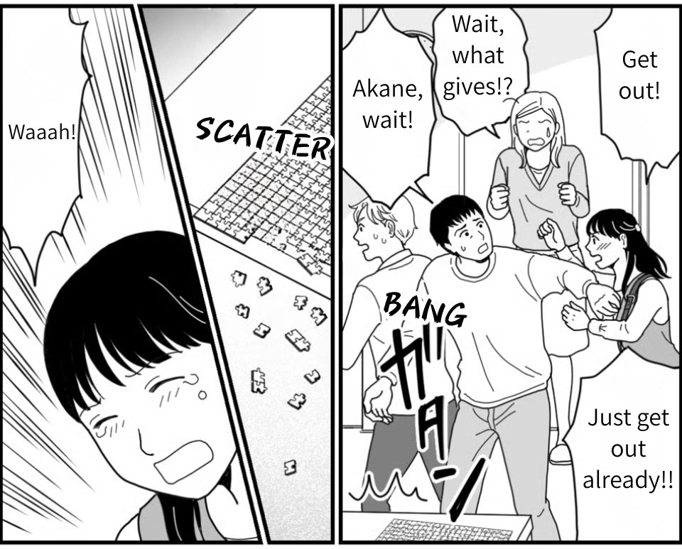 I totally get why Akane was so angry. I mean, no matter how close you are, you don’t just touch someone else’s puzzle-in-progress without permission. She’s been biting her tongue around Taichi for ages, and this was finally the last straw.