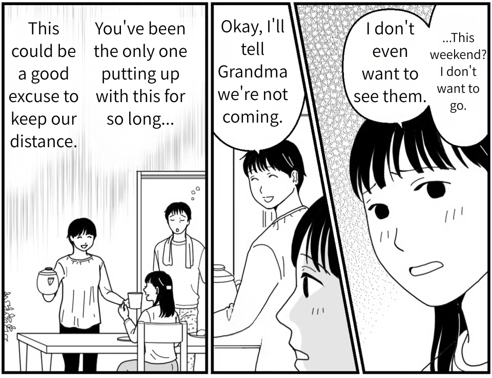 I’m Miyuki. I live with my husband, Shinji, and our daughter, Akane (a 9th grader). My in-laws and my husband’s sister, Honoka, live nearby. Akane and Honoka’s son, Taichi (a 12th grader), basically grew up like siblings. But Taichi has always looked down on Akane. One day, Taichi came over and finished a jigsaw puzzle Akane had been working so hard on without even asking. After putting up with him for years, Akane finally snapped.