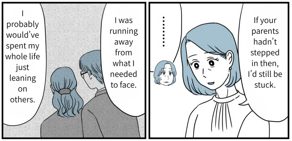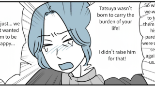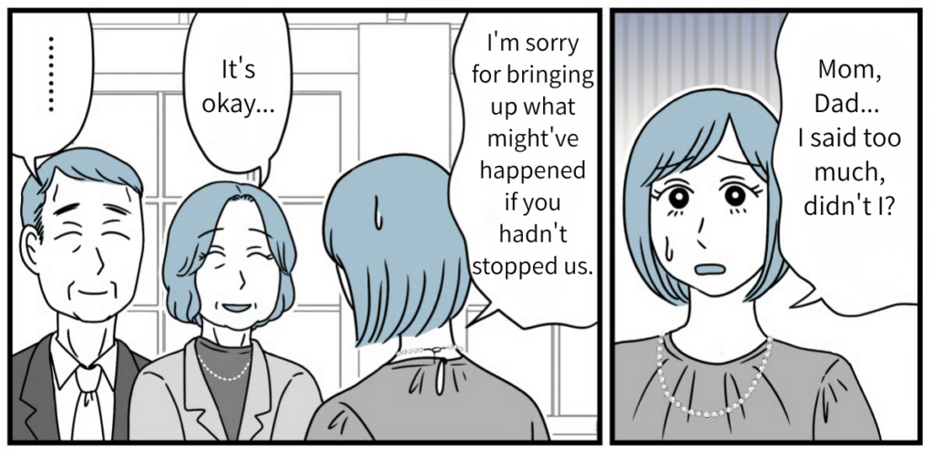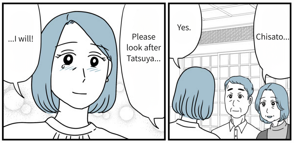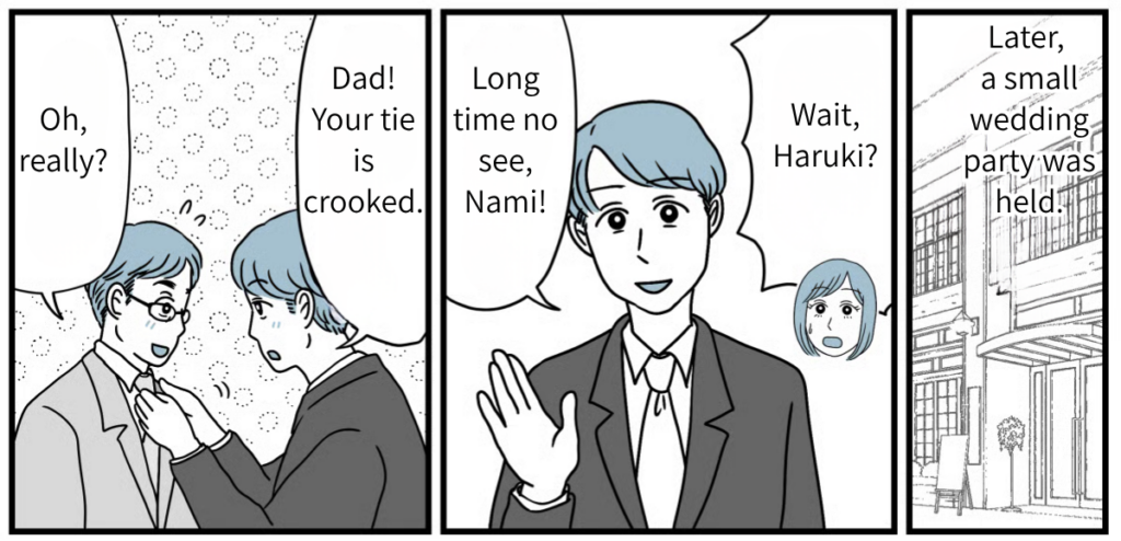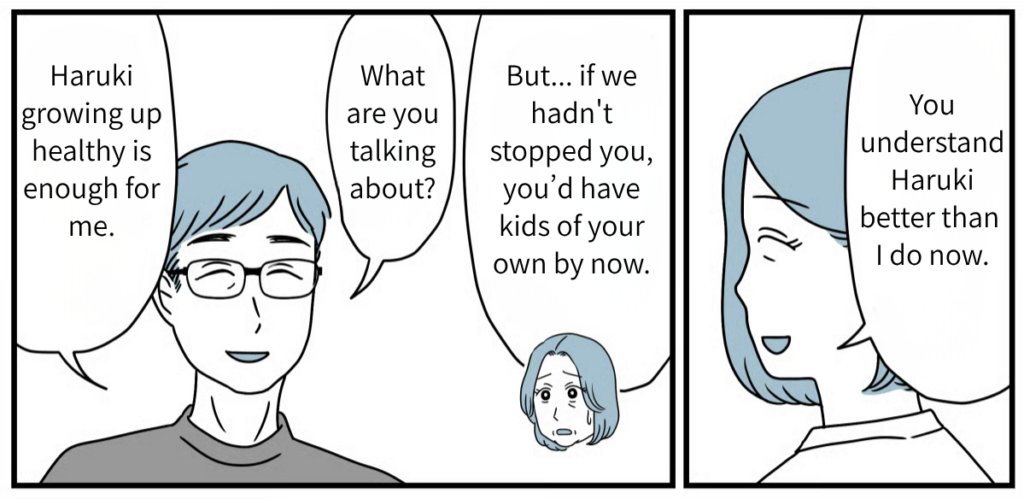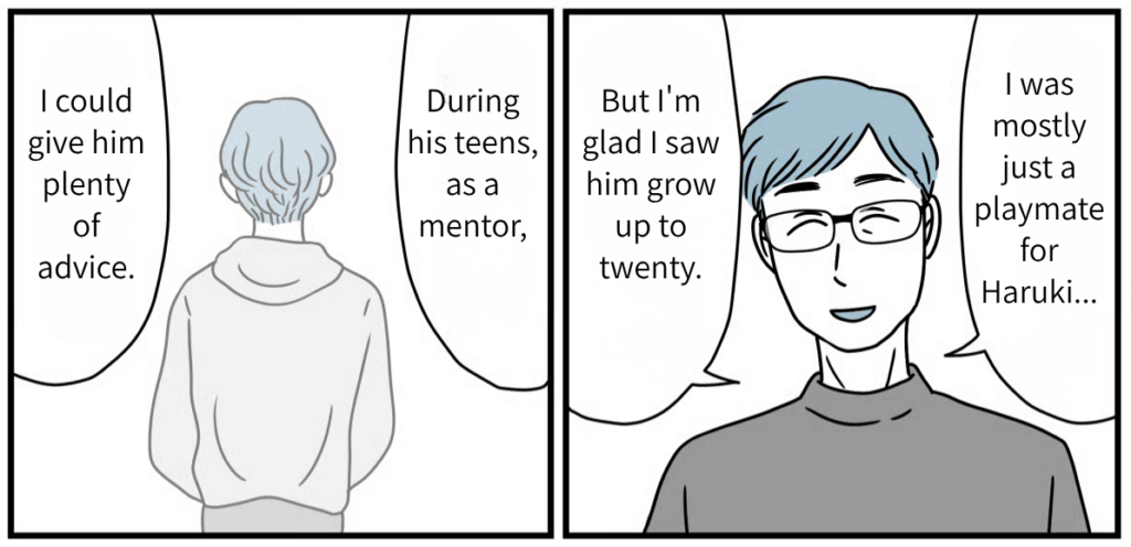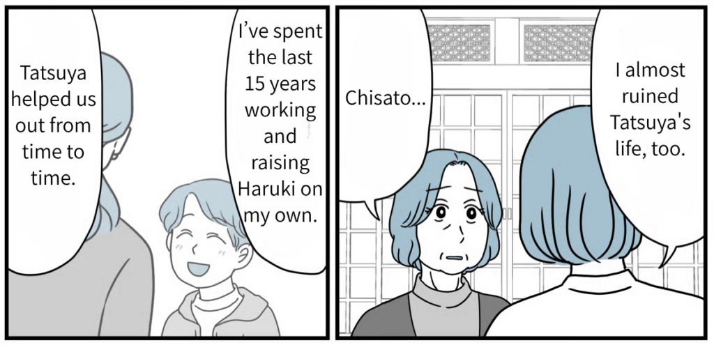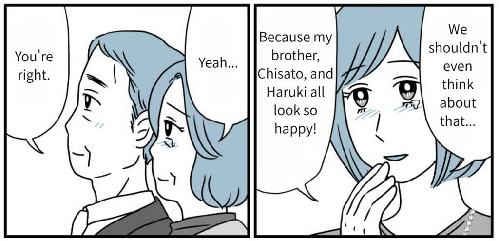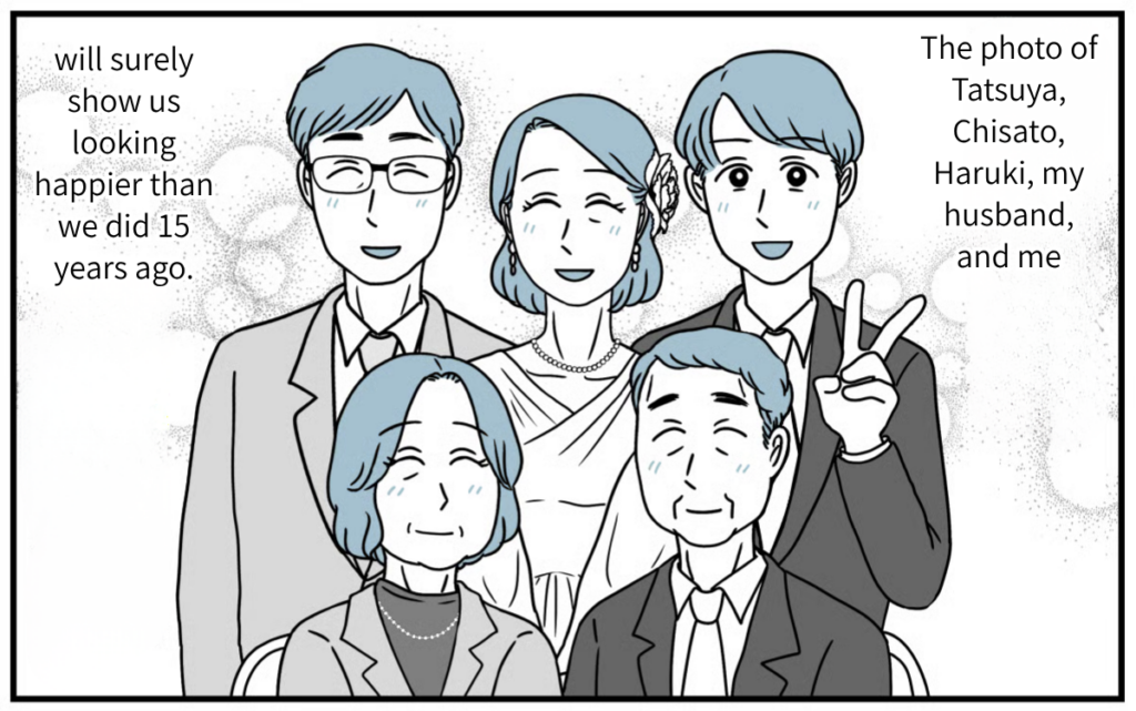 Watching Haruki fix Tatsuya’s tie at the wedding party, Tatsuya looked every bit the “father.” I could tell that over the last fifteen years, the three of them had overcome so much together. Looking at my son’s family and their smiles, that’s just how it felt. To be honest, I still don’t know if opposing them back then was the “right” thing to do. But the smiles on their faces right now are radiant. Tatsuya and his family clearly worked hard to make the path they chose the right one. Rather than regretting what happened fifteen years ago, I want to focus on wishing for their happiness from here on out.